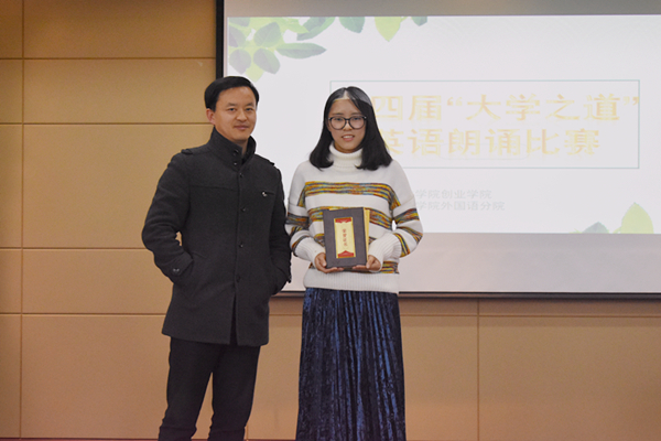 最后,由评委老师们为获奖选手颁奖,张琼文同学荣获一等奖。在现场观众热烈的掌声中,此次英语演讲比赛决赛圆满结束。此次英语朗诵比赛不仅锻炼了同学们的汉语言翻译能力,还激发了同学们学习英语的热情,发展了学习能力,提升了个人内涵。