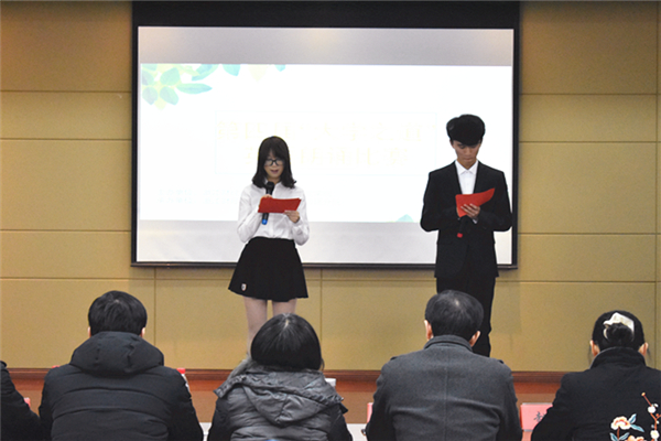 2017年12月12日下午,外国语分院在7教409举办第四届英语朗诵比赛。本次比赛有幸外国语分院副院长张友文老师,大学英语教学部主任赵倩老师,英语专业教学部主任张菊香老师,英语专业老师姜原老师,商务英语专业老师张晓文老师,以及本次比赛负责老师王冶老师和杨菲老师。本次比赛由张海山、付珂宁同学主持。
