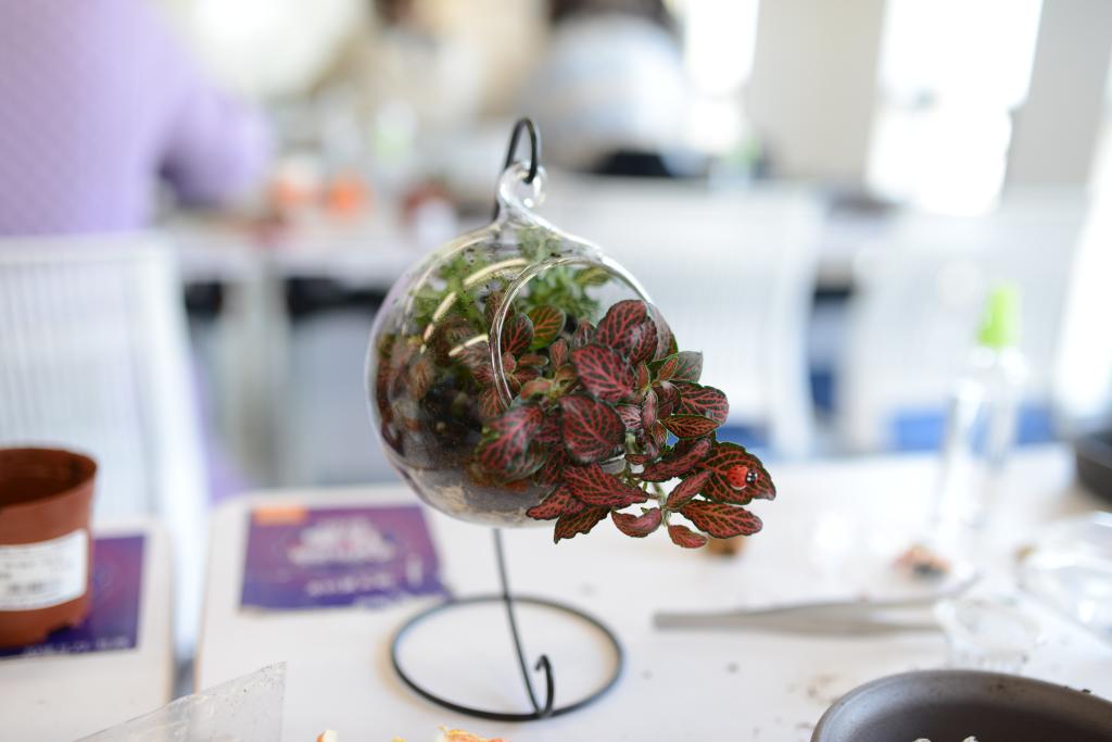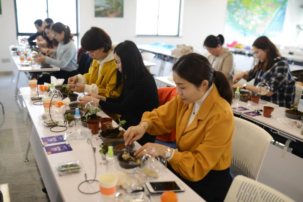 参与活动的女教职工们亲自动手参与植物微景观制作,先在准备好的玻璃容器中铺上干苔藓和营养土,接下来植物按预想的设计栽种,将各种装饰摆件摆在土壤上部,做出自己喜欢的多变造型,一个由老师们自己设计的植物微景观就完成了。