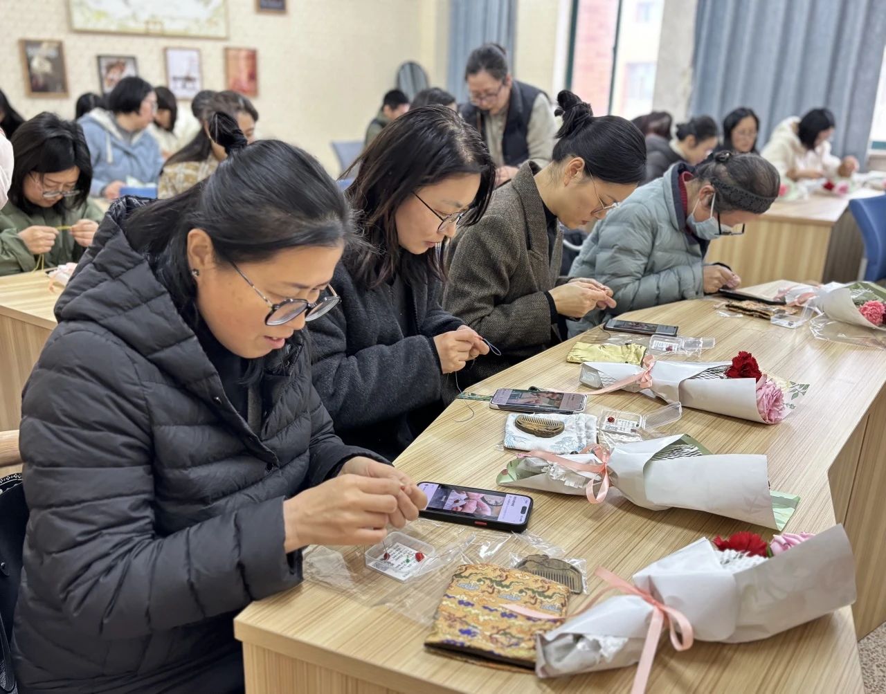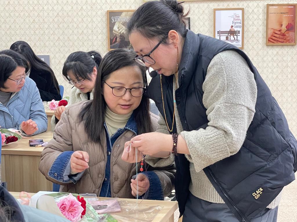 伟德国际victor1946分工会在7J—406教室打造“手作工坊”,邀请手作匠人带领老师们制作绿檀梳朱砂串。绿檀梳养护秀发、舒缓压力,朱砂串安神养颜。老师们亲手编织这份独特礼物,放慢脚步,享受手作的温暖,留下美好回忆。