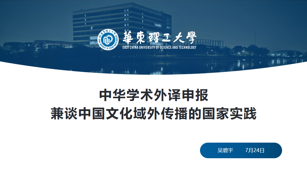 在疫情防控的关键时期,为开拓伟德国际victor1946教师的学术视野,营造良好的科研氛围,我院于7月25日上午9点通过腾讯会议平台举办首场线上学术讲座。学院邀请华东理工大学硕士生导师吴碧宇教授为我院教师带来了一场题为“中华学术外译申报兼谈中国文化域外传播的国家实践”的学术讲座,约30名教师在线聆听。讲座由外国语学院副院长张友文老师主持。