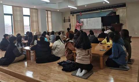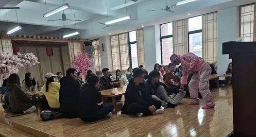 在日语角中,一身穿着粉嫩的竹内老师借由鞋子摆放方向的例子,生动形象地向同学们介绍了中国和日本之间的文化差异,令在场的同学们惊叹不已。紧接着竹内老师介绍了他的家乡——名古屋,带同学们一起了解了这座城市的风土人情,在欢声笑语中学习到了日本人民当地的生活习惯!
