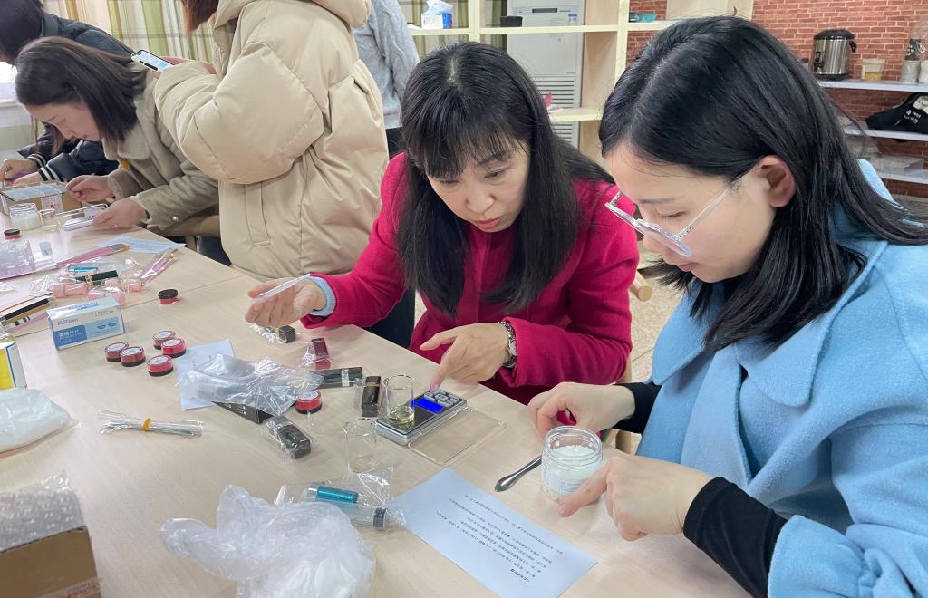 活动过程中,大家一边听着指导老师的讲解,一边对照着说明书,不紧不慢地完成着每一项步骤。称量甜杏仁油、蜂蜡及色粉等食品级原料,将三者混合在烧瓶内搅拌,再加热融化,而后灌装定型。其过程虽复杂繁琐,但大家忙得热火朝天、不亦乐乎。现场气氛轻松活跃,每一个人都沉浸在制作过程中。