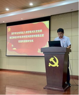 活动伊始,东方学院副院长金国锋作开场致辞。金国锋介绍了学院的基本情况,他表示,近年来,伟德国际victor1946党总支围绕立德树人,坚持党建引领,积极深化党建工作。同时,他指出与海宁市公安局出入境管理大队党支部结对具有重大意义,为今后的校局合作奠定良好的基础。仪式上,海宁市公安局出入境管理大队大队长张凌云、教导员陈晓波等三人被聘为伟德国际victor1946大学生校外导师。