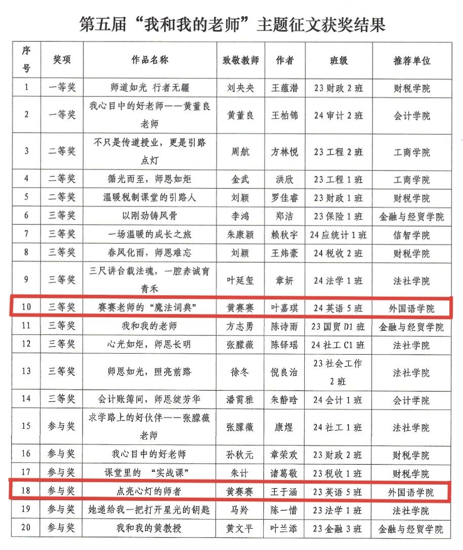 在此,特向获奖同学表示热烈祝贺!纸短情长意未尽,师恩难忘励前行,愿外院学子以笔为媒、以情为墨,在传承师道中汲取力量,在逐梦征程中书写担当,绽放更加绚丽的青春光彩!