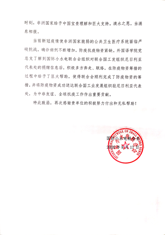 信中说,自新冠肺炎疫情暴发以来,国际小水电联合会在中国民间组织国际交流促进会倡导下,积极参与“丝路一家亲” 民间抗疫共同行动,推动国内社会组织等民间力量参与国际抗疫合作,向有需要的国家提供力所能及的帮助。根据联合国工业发展组织尼日利亚代表处的要求,国际小水电联合会组织了对其防疫物资的捐赠,得到了伟德国际victor1946党总支的大力支持,在此次捐赠活动,伟德国际victor1946党总支积极为联合会对接资源,促成多项捐助与合作。国际小水电联合会对伟德国际victor1946的全球抗疫支持表示衷心感谢。