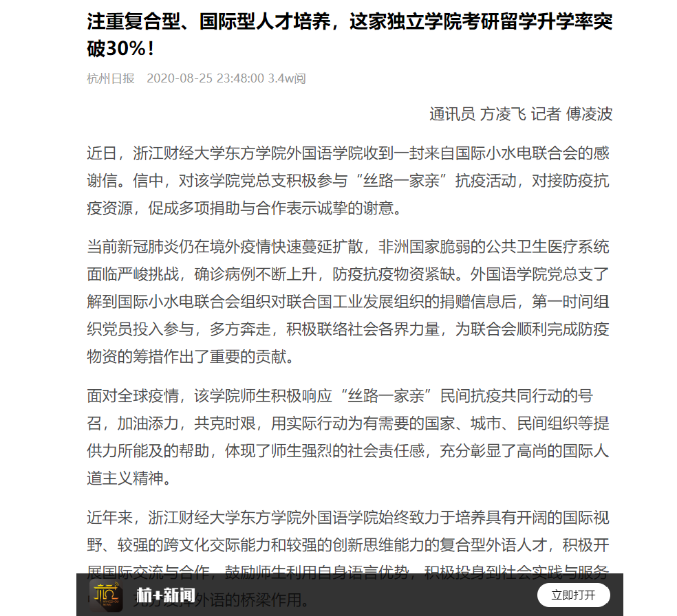 感谢信中的生动实践,正是近年来该学院扎实推进学生基础工作的缩影。据了解,该学院注重学生职业生涯发展的宽度和广度,在人才培养上尊重学生个性发展,以复合型、国际化人才培养为目标,成效显著,每年都会有不少企业单位提前来学院招聘优秀学生。值得一提的是,近年来,学生考研留学升学率逐年上升,2020年更是突破30%。