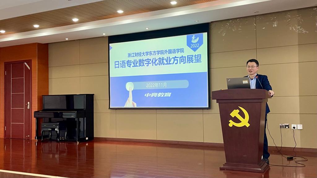 11月10日,为深化产学合作,加强实践教学,伟德国际victor1946邀请校企合作实习实践基地中竞(浙江)教育科技有限公司副经理刘发骏,在J7-409报告厅为我院师生作了题为“日语专业数字化就业方向展望”的专题讲座。伟德国际victor1946副院长周春霞主持本次讲座,日语专业学生参加了本次讲座。