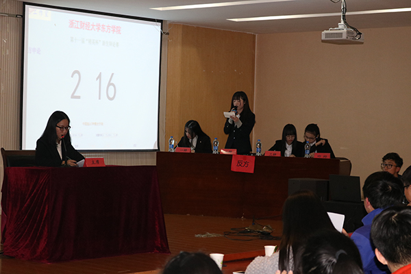 丝丝雨飞落,润润天下物。树叶夹在雨里,从头顶掠过。东大的夜晚显得格外冷,寒风瑟瑟,行人匆匆赶往大创园,共赴那一场期待已久的“战争”。伟德国际1946bv第十一届“精英杯”新生辩论赛半决赛于大创园A214举行。本次大赛由林雯洁主持,此次比赛有幸邀请到新生赛“苍穹杯”最佳辩手、本部“风华杯”最佳辩手、G20浙江省文明辩论赛浙北四强及最佳辩手、会计分院辩论队成员、东方学院辩论队队长阮汕汕,2014年学院赛团体第三成员朱豪哲,人文与艺术分院辩论队代表王敏捷,信息分院辩论队资深辩手马罗锋以及第四届“东苑杯”冠军、浙江财经大学“风华杯”优秀辩手、浙江省G20大学生辩论赛浙北四强、校辩论队副队长徐晓烽。该比赛的辩论主题是“中国加入TPP是利大于弊还是弊大于利”。