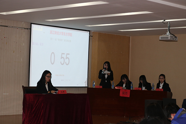 比赛伊始,双方辩手做了各具特色的自我介绍,作为反方的外国语辩论队,更是用外文介绍惊艳全场。财税代表队辩手——正方一辩的开篇陈词将比赛大幕揭开。